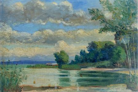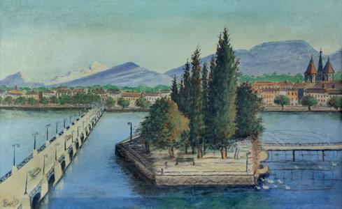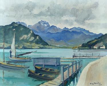Lac d'Annecy, huile sur toile, signée et datée 1938, 45,5x55 cm....