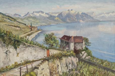 Vue du lac Léman depuis le Lavaux, huile sur toile, signée, 40x6...