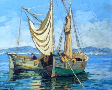 Manœuvre sur une barque, huile sur toile, signée, 54,5x66 cm.
