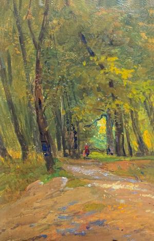 Promeneur en sous-bois, huile sur carton, 39x25 cm