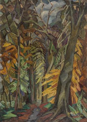 Foret en automne, huile sur toile signée et datée 1957, 92x66 cm