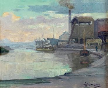 Industries en bord de rivière, huile sur carton signée, 23x27 cm