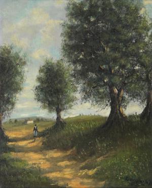 Jeune femme sur un sentier, huile sur toile, 61x50 cm