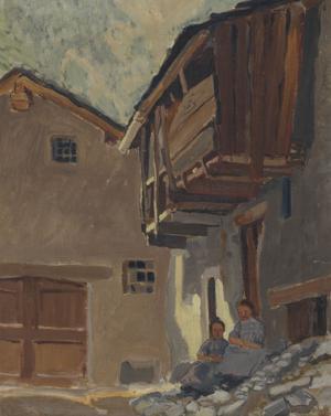 Femmes dans un village en montagne, huile sur toile, 48x38 cm