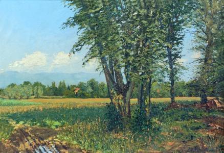 Campagne genevoise, huile sur carton, signature illisible, datée...