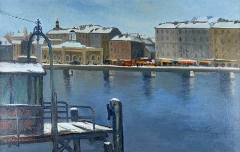Pont de la Machine à Genève, huile sur toile, signée et datée au...