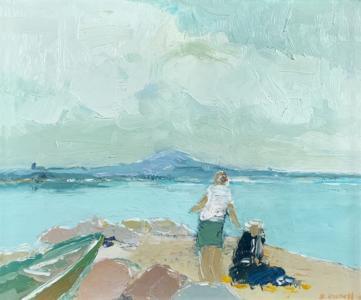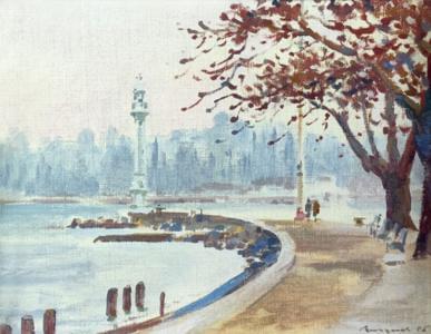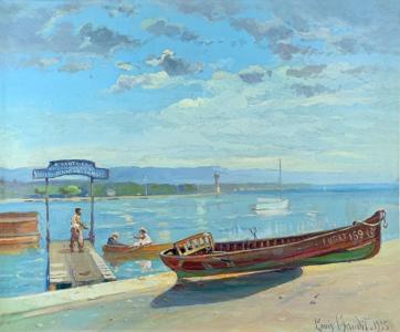 Bains des Pâquis, huile sur carton, signée Barraud et datée 56,...