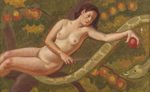 Eve et le serpent, huile sur toile, signée, 38x60 cm