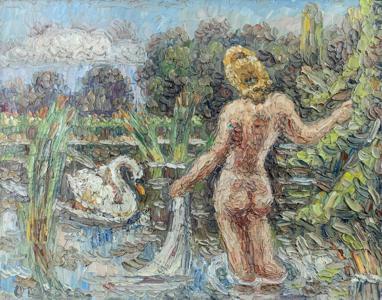 Leda et le cygne, huile sur toile, signature illisible, 45x60 cm