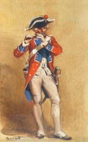 Soldat à la flûte, huile sur panneau, signée, 21x13 cm