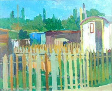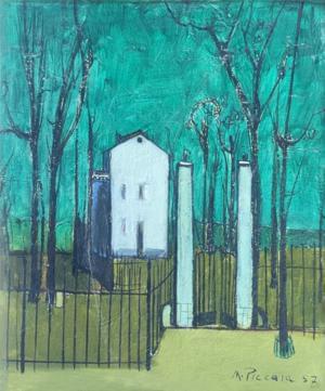 La grille et la maison, huile sur carton, datée 57, 39x32 cm