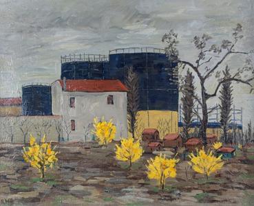 Les silos, huile sur toile, monogrammée RMB, 65x80 cm.