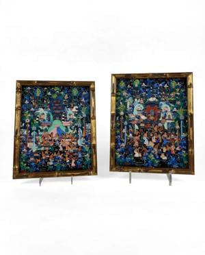 Petits oiseaux et écureuil sous la neige, paire d'acryliques sur...