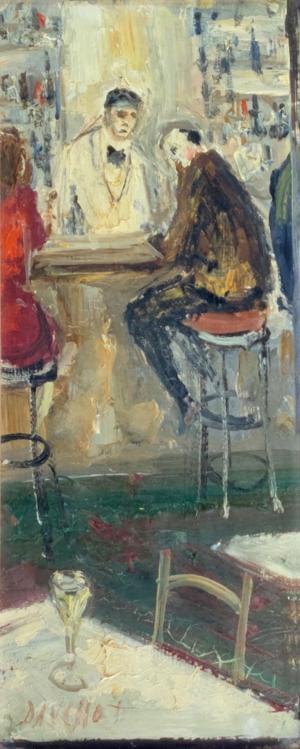 Confession au bar, huile sur toile, signée, 46x18 cm