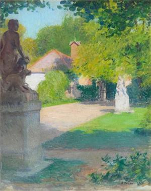 Statue au jardin, huile sur toile, signée et datée, 41x33 cm