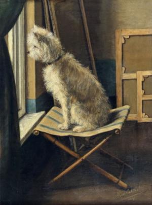 Westie à la fenêtre, huile sur toile, datée 1891, 47x35 cm