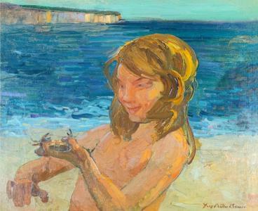 Jeune fille au crabe, huile sur toile signée, 50x60 cm