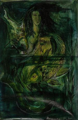Femme et poisson, huile sur papier, signée, 38x25 cm