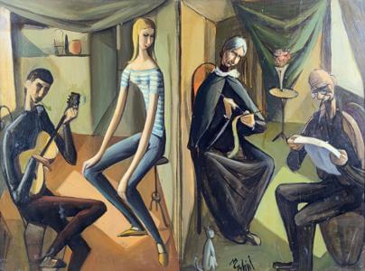 Les âges de la vie: deux couples, huile sur isorel signée, 53x72...