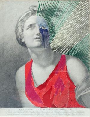 Antigone, gravure retouchée avec des fils de laines multicolores...