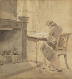 Homme dans un intérieur avec un chien, mine de plomb sur papier,...