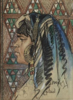 Portrait d'une orientale de profil, fusain et gouache sur papier...