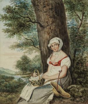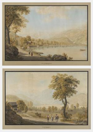 Paire de lavis: vue de lac et montagne et paysans et vache, l'un...