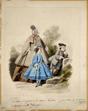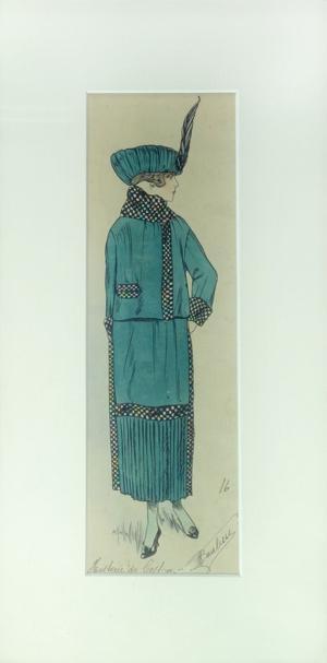 Histoire du costume, femme à la toque et à la robe bleue, encre...