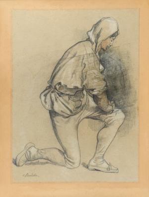 Homme agenouillé, fusain et craie sur papier, signé, 51x37 cm