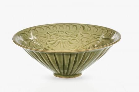 Grès à glaçure céladon à motif incisé de fleurs, D 20,5 cm.