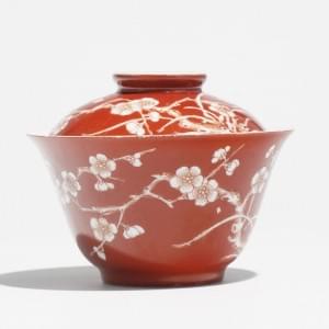 Porcelaine à décor de fleurs de prunus sur fond rouge corail, D...
