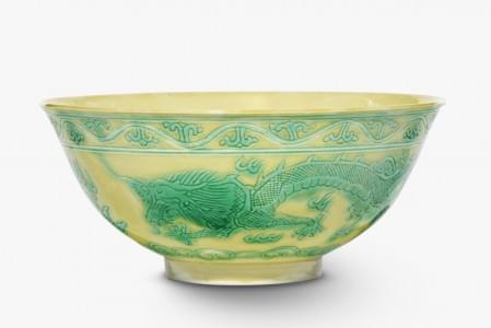 Porcelaine émaillée de dragons verts sur fond jaune, D 13,5 cm
