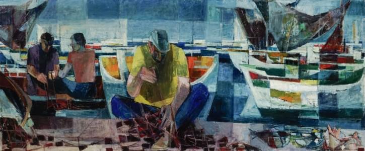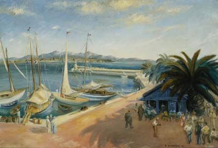 Port de pêche en Espagne, 1960, huile sur toile, signée et datée...