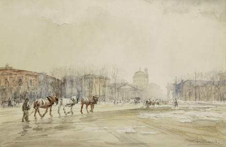 La place de la Madeleine sous la neige, pastel, signé, 37x51 cm