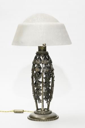 Pied en fer forgé à décor de feuilles de ginko biloba, abat-jour...