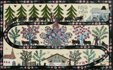 Découpage à motif d'une montée à l'alpage, signé et daté 1981, 1...
