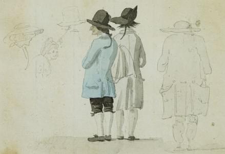 Personnages de dos, aquarelle et plume sur papier, 10x15 cm