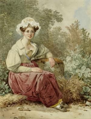 Jeune femme assise dans la nature, aquarelle sur papier signée S...