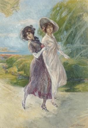 Deux élégantes , aquarelle, gouache et pastel sur papier, 41x28...