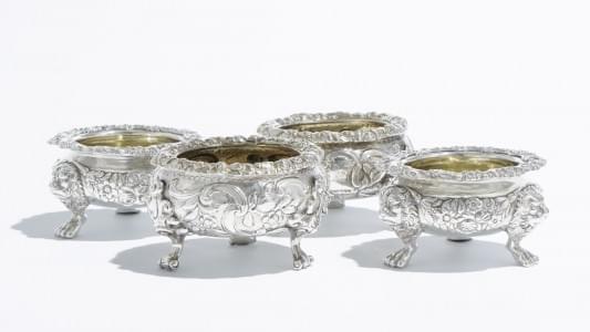 494. Deux paires de salerons d'époque George III à motif de volutes,...