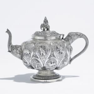 509. Théière boule repoussée de médaillons goutte à motif d'animaux,...