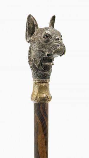 595. Fabergé, canne à pommeau en forme de tête de bouledogue français...