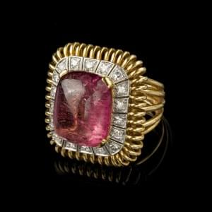 709. Bague sertie d'une tourmaline rose en cabochon entourée de diama...