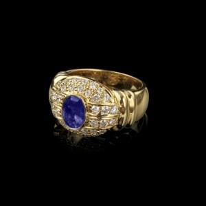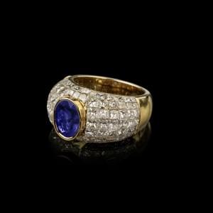 718. Bague ceinture sertie d'un saphir épaulé de diamants taille prin...
