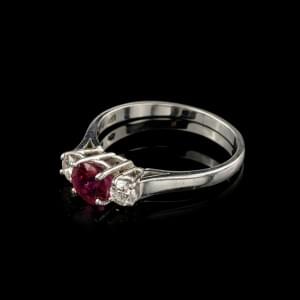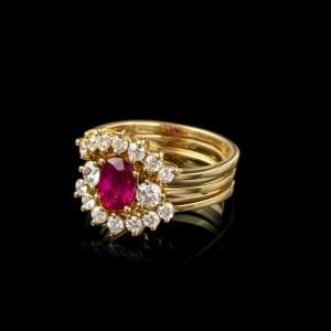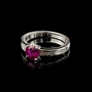749. Bague sertie d'un rubis rond (env. 1 ct) épaulé de diamants tail...