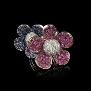 752. Bague à motif de deux fleurs l'une sertie de saphirs et de diama...