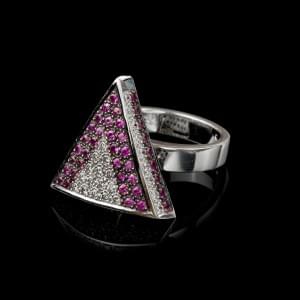 766. Bague triangle pavée de diamants (env. 0,65 ct) et de saphirs ro...