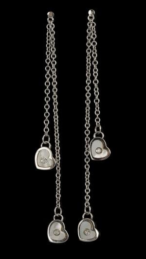 774. Boucles d'oreilles longues retenant des cœurs de nacre sertis de...