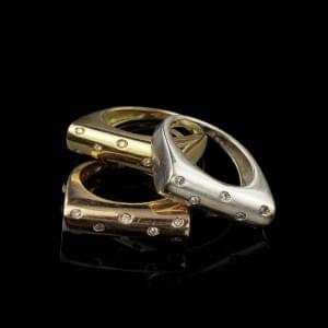 808. Trois bagues trois ors rectangulaires serties de diamants