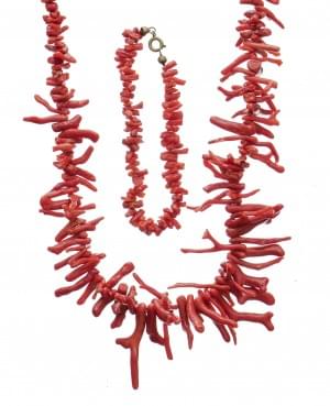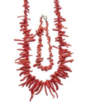 3135. Lot de trois bracelets, l'un de deux rangs de perles de corail,...
